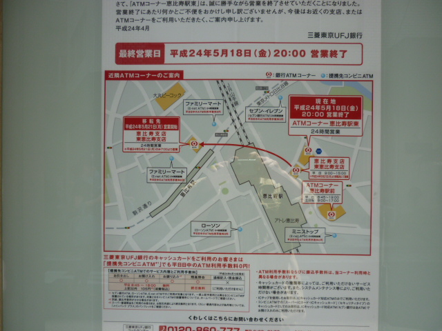 JR恵比寿駅の東側にあった、三菱東京UFJ銀行の店舗がまとめて2店の閉鎖案内。